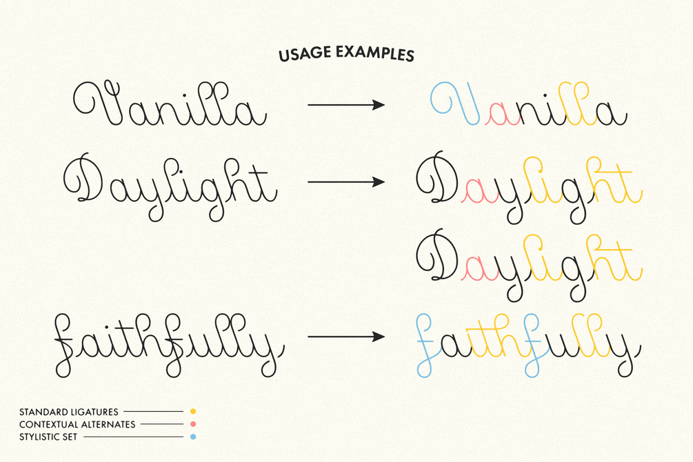 It features a diverse range of stylistic alternates, contextual alternates, and standard ligatures, ensuring that you’ve countless options to choose from for your design work. This font family is delicately crafted and well thought out with every little detail in mind, to ensure its ease and versatility when used!