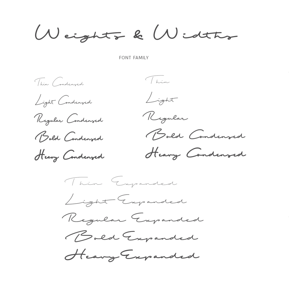 I have written each words multiple times to achieve the organic and natural flow with a bit spaced out style script. This font is an existing work of mine that came in only one weight. Now I added multiple weights I as well as expanded and condensed instances, along with a variable font file that can be set to anything in between Thin Condensed to Heavy expanded.